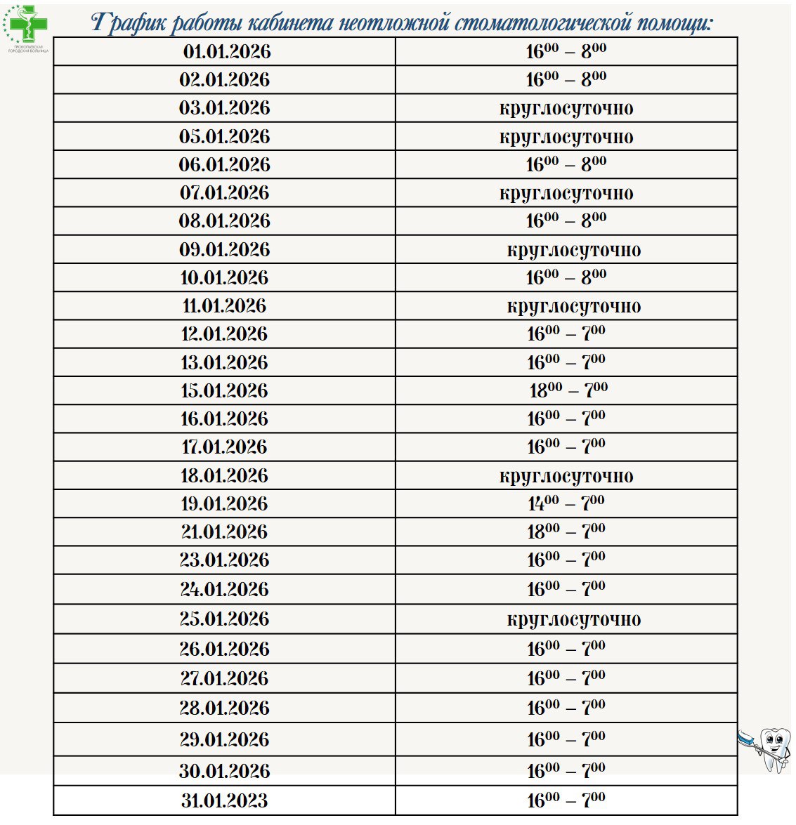Напоминаем о графике работы стоматологической службы в январе. ☝️
