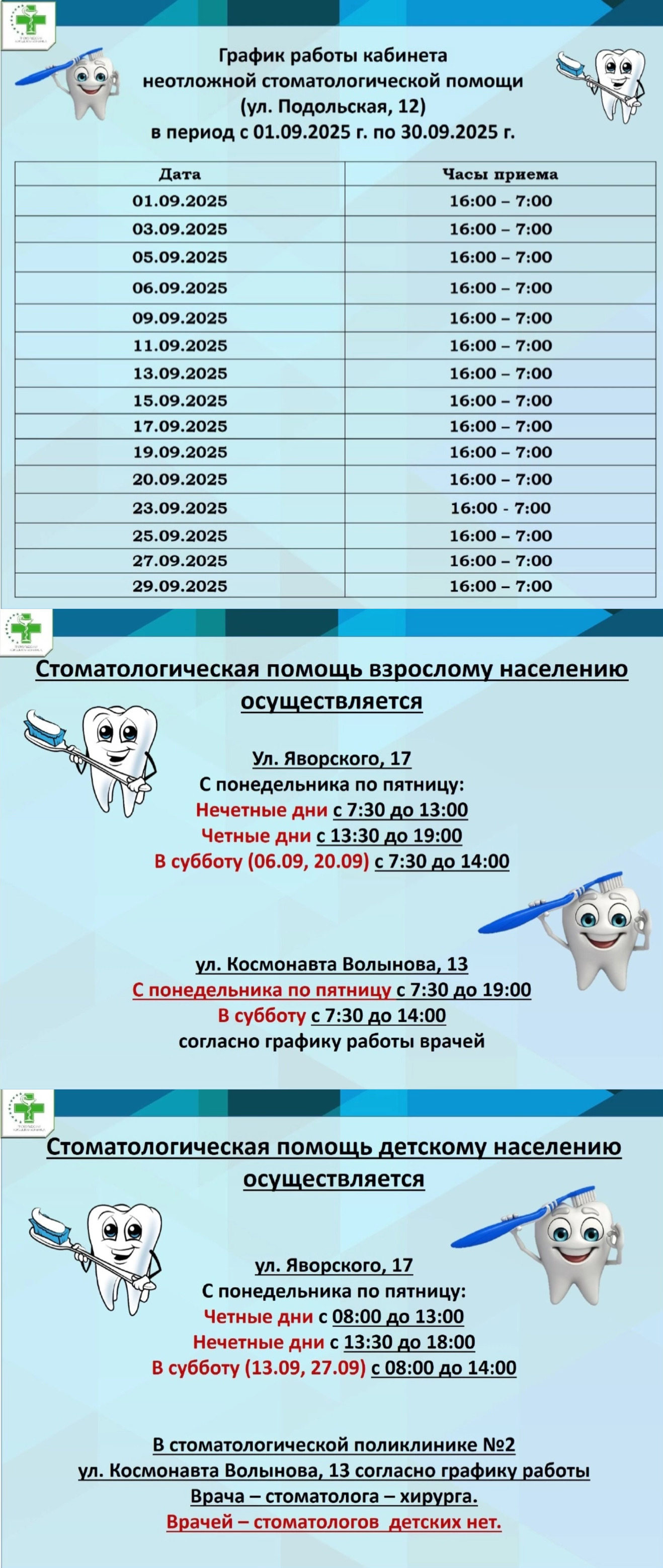 Информируем о графике работы стоматологической службы в период с 01 по 30 сентября