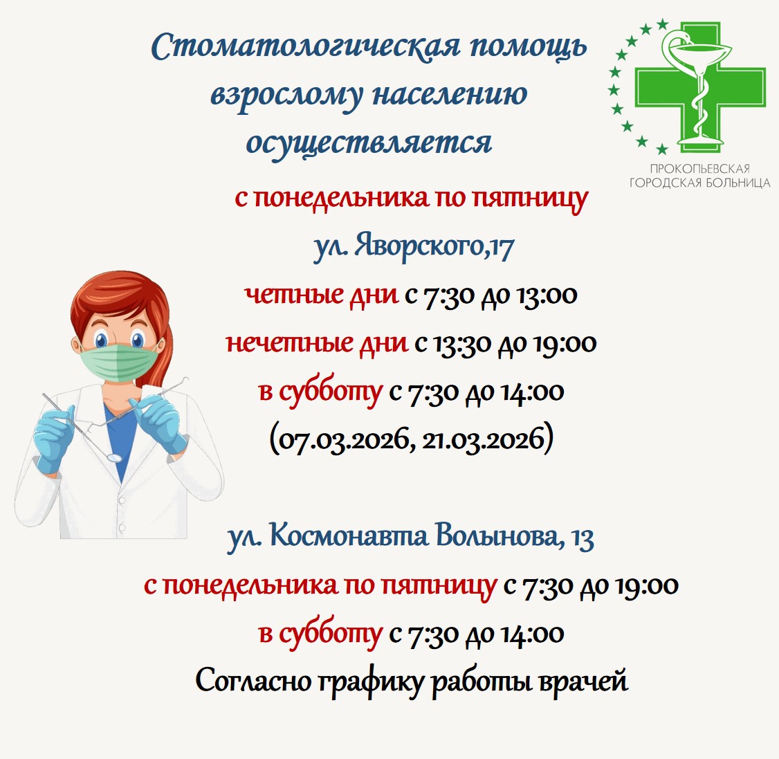 Информируем о графике работы стоматологической службы в период с 01 по 31 марта